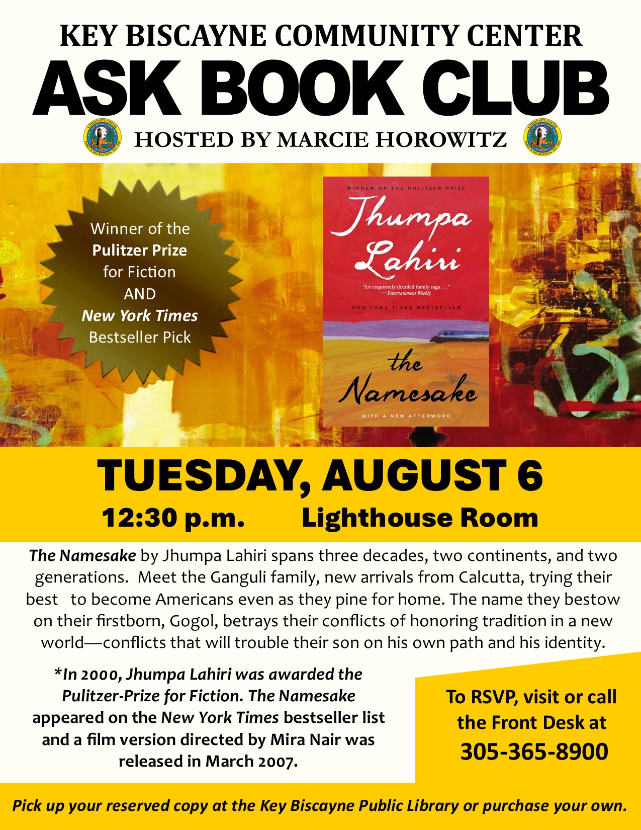 TUESDAY, AUGUST 6 @ 12:30 PM – A.S.K. BOOK CLUB AND DISCUSSION: Join friends for a discussion on the book The Namesake by Jhumpa Lahiri. Located in the Lighthouse Room.