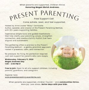 In the spirit of Megan Welsh Andrews day let us honor her legacy by continuing to support parents through the Present Parenting method. Join us via Zoom on 2.11 for a free Parenting support call. This call is for all those who support children (parents, grandparents, guardians, caregivers). This is The Megan Way!
