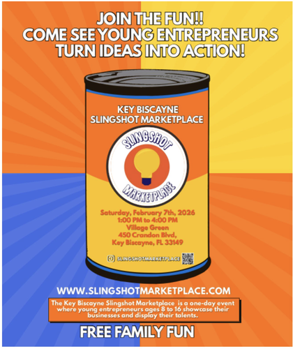 SATURDAY, FEBRUARY 7 @ 1:00-4:00 PM – KB SLINGSHOT MARKETPLACE EVENT: The Key Biscayne Kid’s Marketplace 2026 will motivate young entrepreneurs to recognize their ideas and turn them into action.